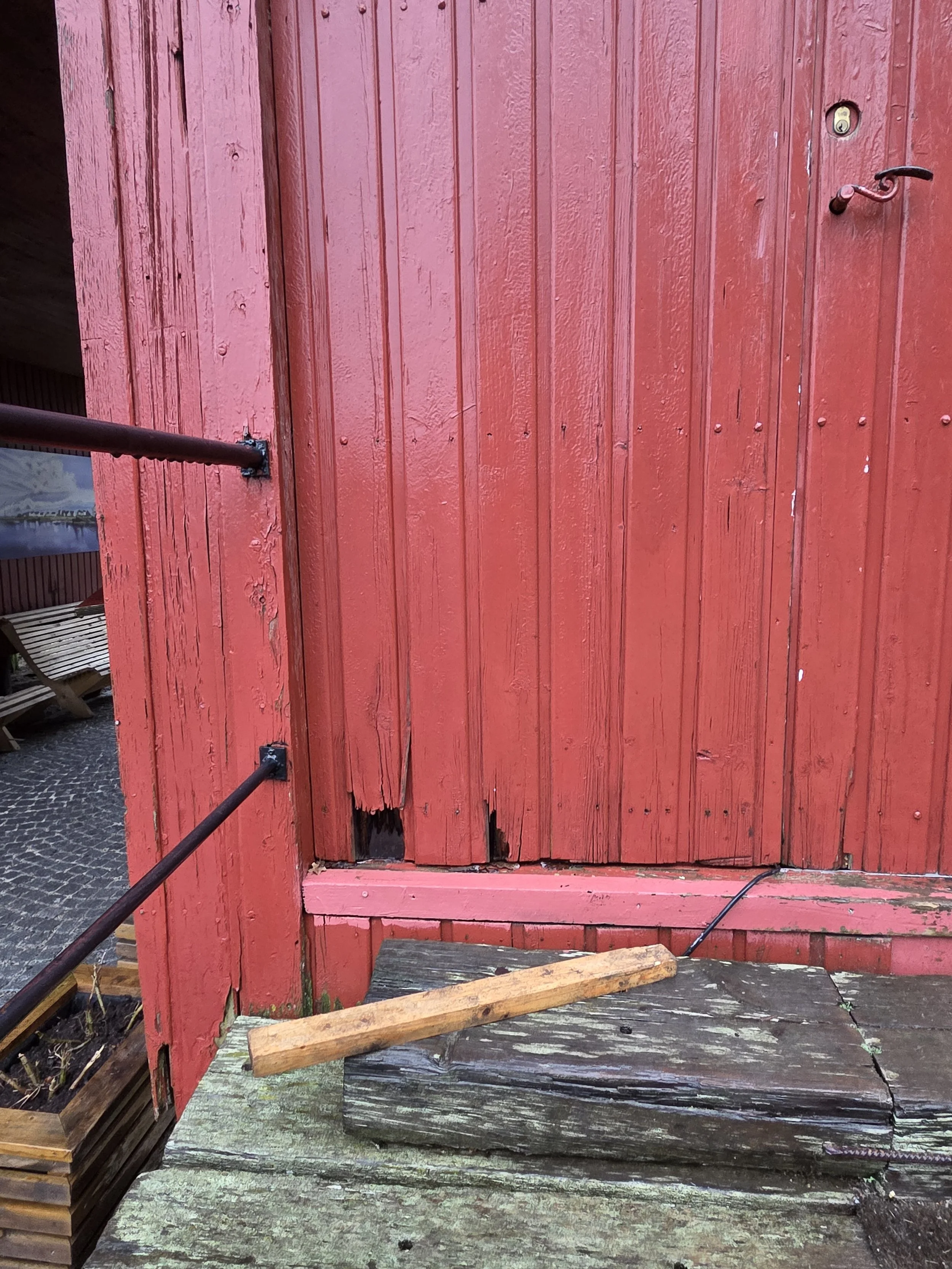 Ny inngangsdør skal det også bli! Her skal det lags kopi av den gamle ytterdøra som nå befinner seg i andre etasje. Foto: Tone Berge