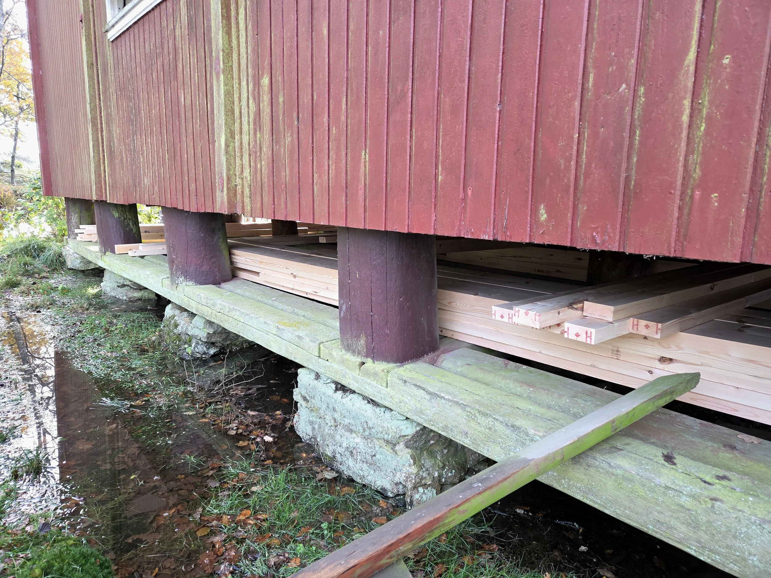 Her settes det på nye malmfurubord før det skal blåses inn isolasjon i hulrommet mot eksisterende innegulv. Foto: Tone Berge
